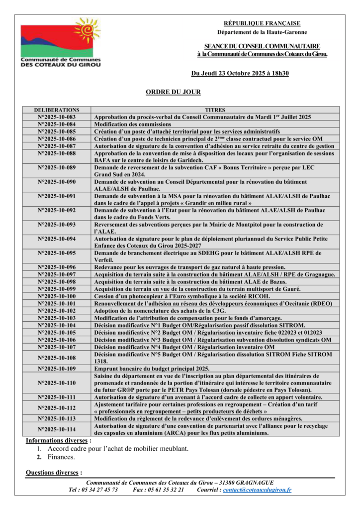 A la Communauté de Communes des Coteaux du Girou, 1 rue du Girou, 31380 GRAGNAGUE