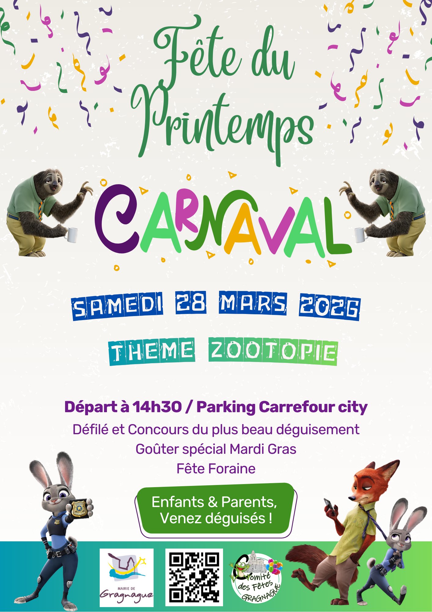 Le Comité des Fêtes vous convie le samedi 28 mars pour un défilé haut en couleurs sur le thème de la ville la plus animée du monde, inspirée par les personnages emblématiques comme Judy Hopps et Nick Wilde.
