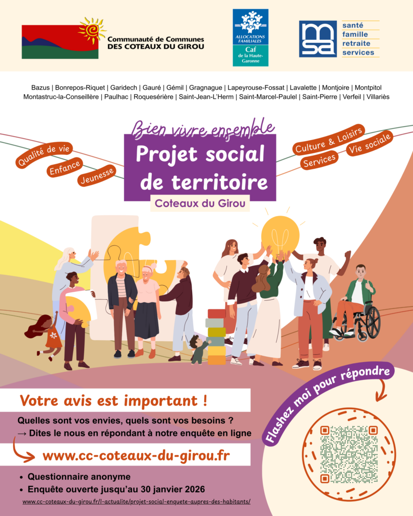 La Communauté des Communes des Coteaux du Girou (C3G) est engagée dans une démarche de co-construction de son projet social de territoire en partenariat avec la CAF et la MSA de la Haute Garonne et l’ensemble des acteurs du territoire.