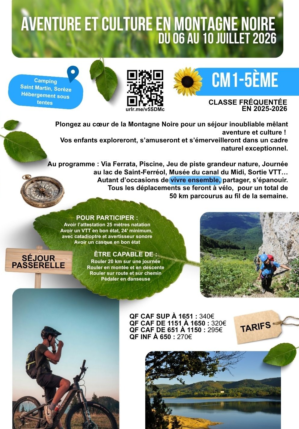 Au programme : Via Ferrata, Piscine, Jeu de piste grandeur nature, Journée au lac de Saint-Ferréol, Musée du canal du Midi, Sortie VTT…