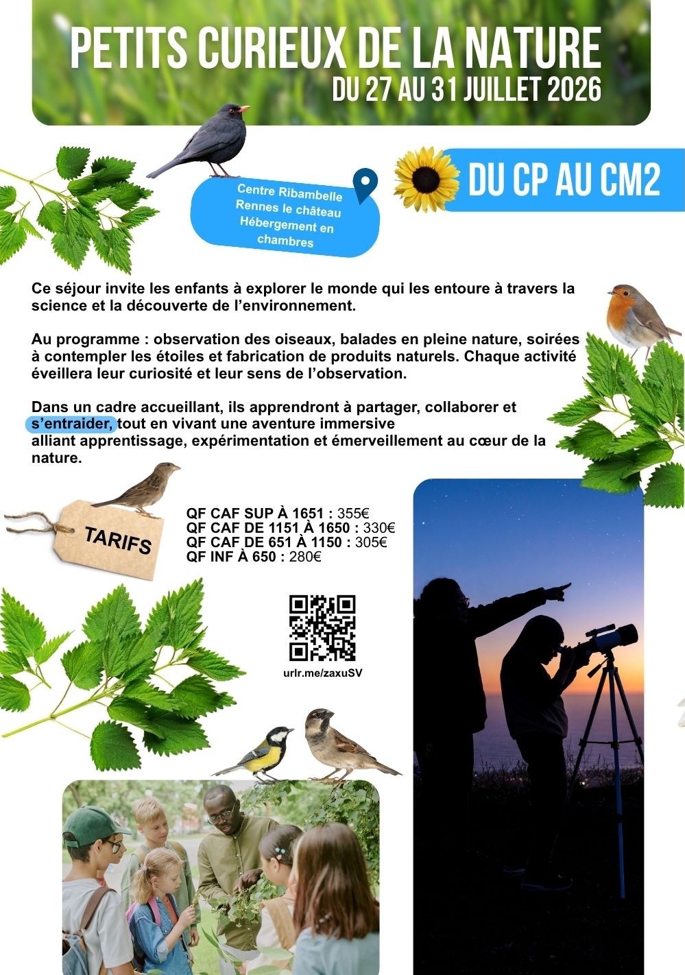 Au programme : observation des oiseaux, balades en pleine nature, soirées à contempler les étoiles et fabrication de produits naturels. Chaque activité éveillera leur curiosité et leur sens de l’observation.