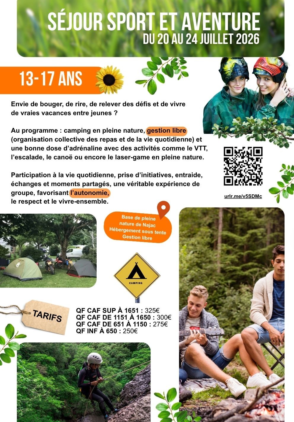 Au programme : camping en pleine nature, gestion libre (organisation collective des repas et de la vie quotidienne) et une bonne dose d’adrénaline avec des activités comme le VTT, l’escalade, le canoë ou encore le laser-game en pleine nature.