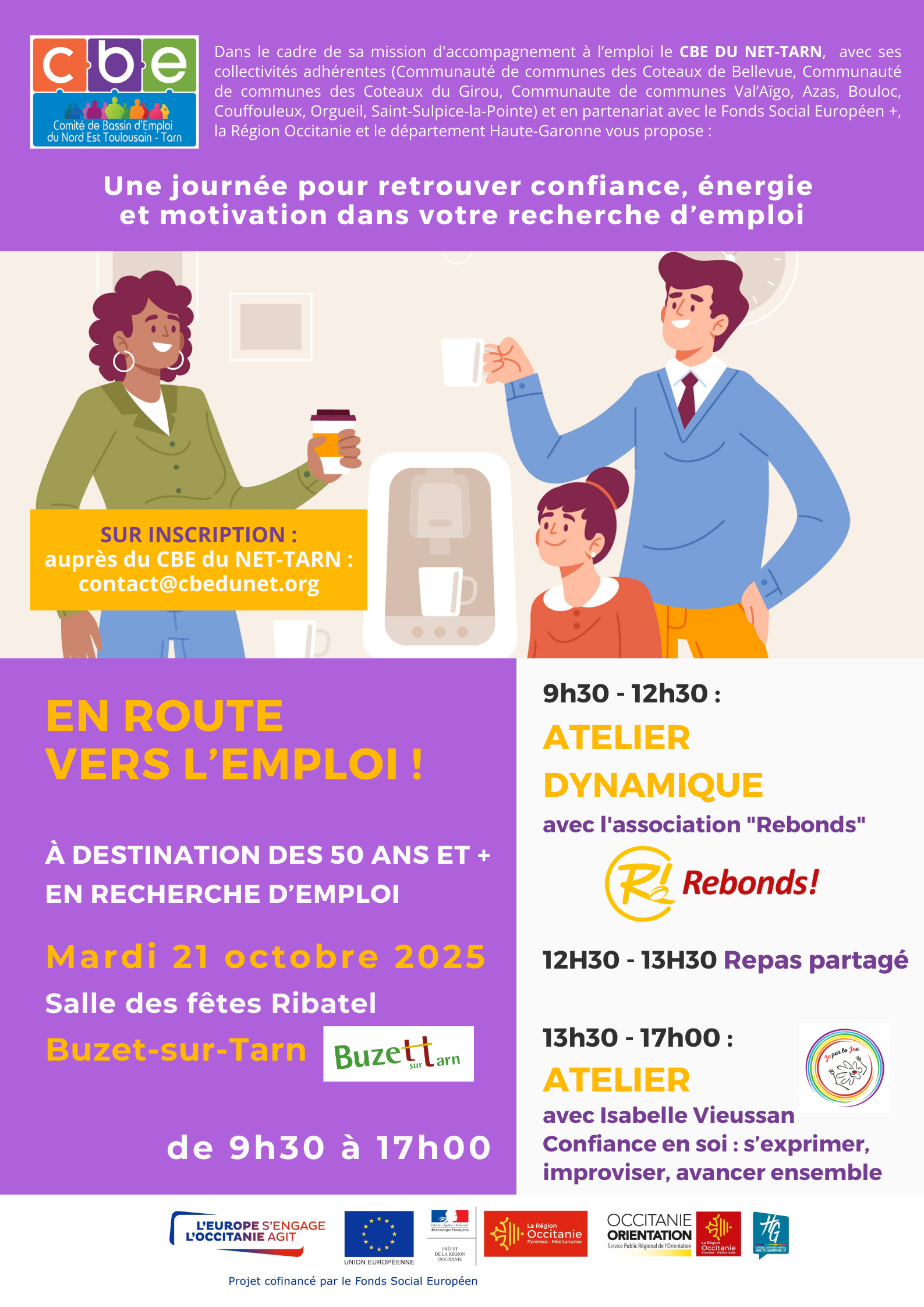 Dans le cadre de sa mission d’accompagnement à l’emploi, le CBE du NET-TARN, avec ses collectivités adhérentes (Communauté de Communes des Coteaux de Bellevue, Communauté de Communes des Coteaux du Girou, Communauté de Communes Val’Aigo, Azas, Bouloc, Couffouleux, Orgueil, Saint-Sulpice-la-Pointe) et en partenariat avec le Fonds Social Européen + la Région Occitanie et le département Haute-Garonne vous propose une journée pour retrouver confiance, énergie et motivation dans votre recherche d’emploi.