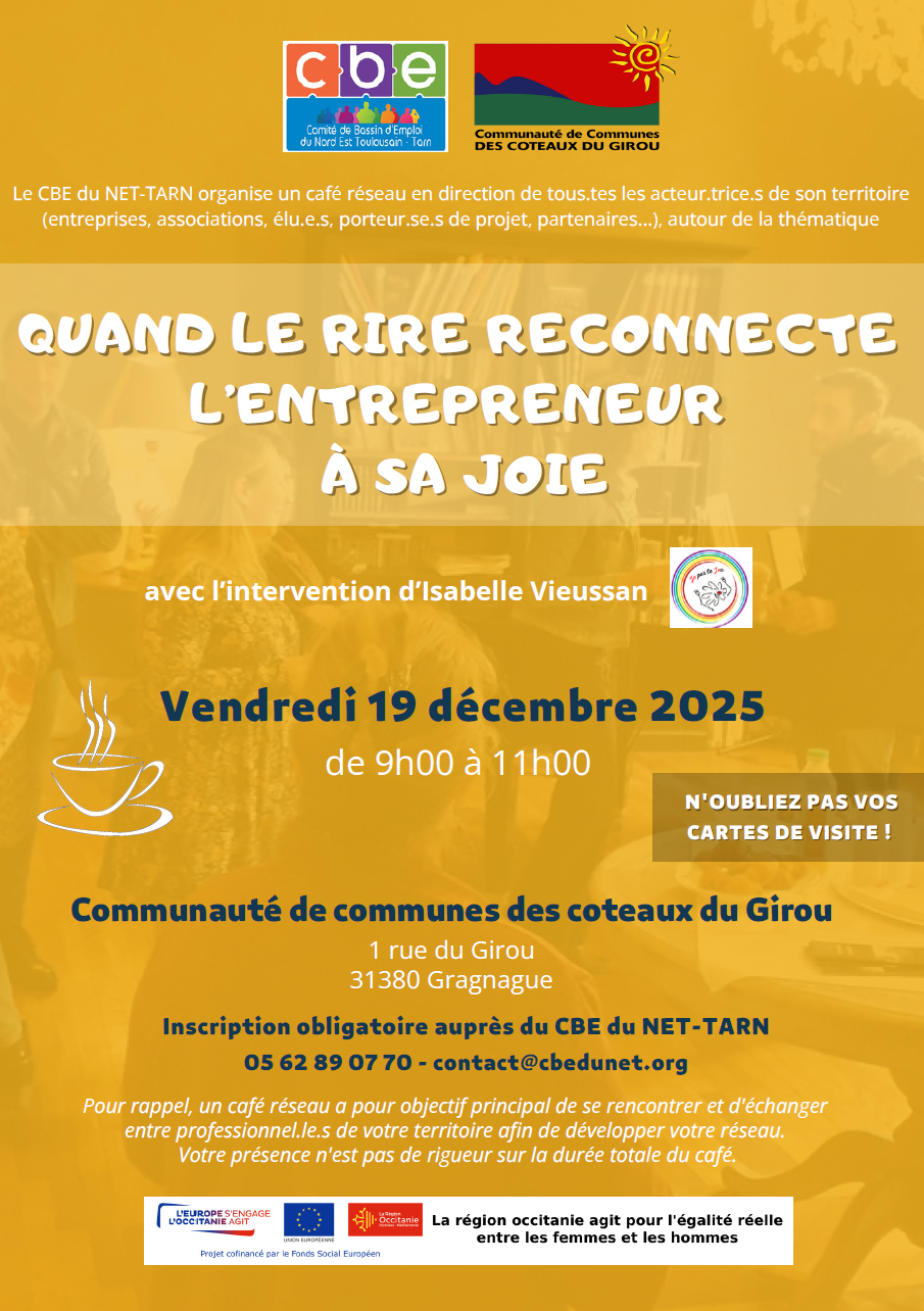 Le CBE du NET-TARN organise un café réseau en direction de tous les acteurs de son territoire (entreprises, associations, élus, porteurs de projet, partenaires…), autour de la thématique :
